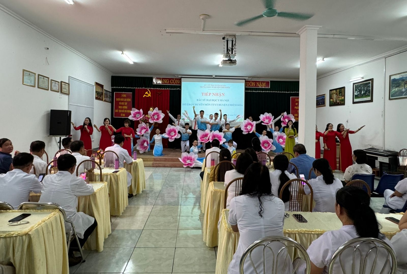Chiều ngày 4/6, TTYT huyện Chiêm Hóa tổ chức chương trình tiếp nhận Bác sĩ Bệnh viện Đại học Y Hà Nội lên hỗ trợ chuyên môn tại Trung tâm. Dự chương trình có BS.CKII. Nguyễn Thành Hưng - Bí thư Đảng ủy, Giám đốc Sở Y Tế, Đ/c Hà Thị Minh Quang, Ủy viên Ban Thường vụ Huyện ủy, Phó Chủ tịch UBND huyện Chiêm Hóa; Lãnh đạo một số cơ quan trên địa bàn huyện, Lãnh đạo UBND thị trấn Vĩnh Lộc,… Trưởng, phó các khoa, phòng, Trưởng các TYT xã thuộc TTYT huyện Chiêm Hóa.
