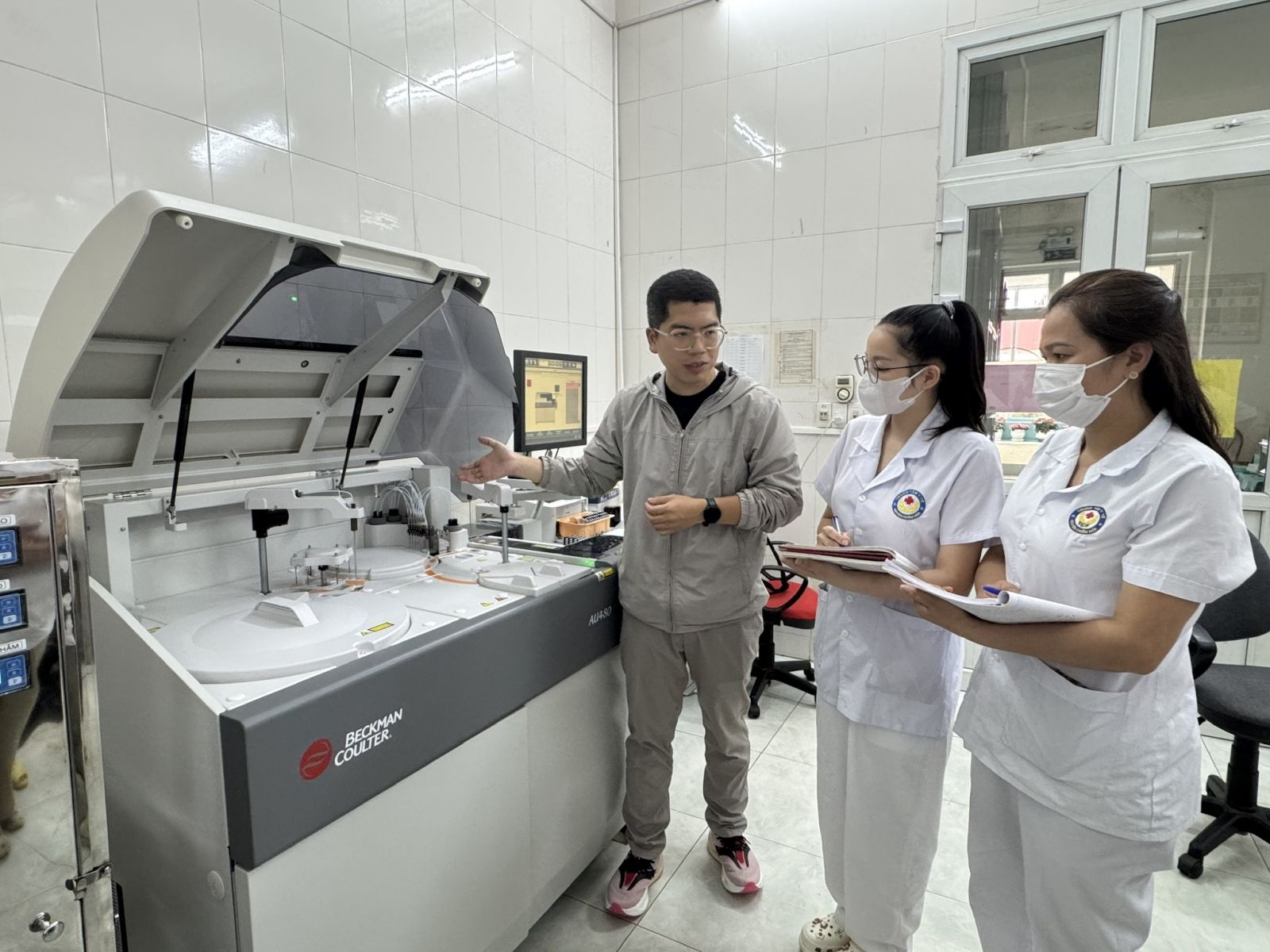 Kỹ sư đang hướng dẫn khoa xét nghiệm sử dụng máy xét nghiệm hóa sinh tự động AU480