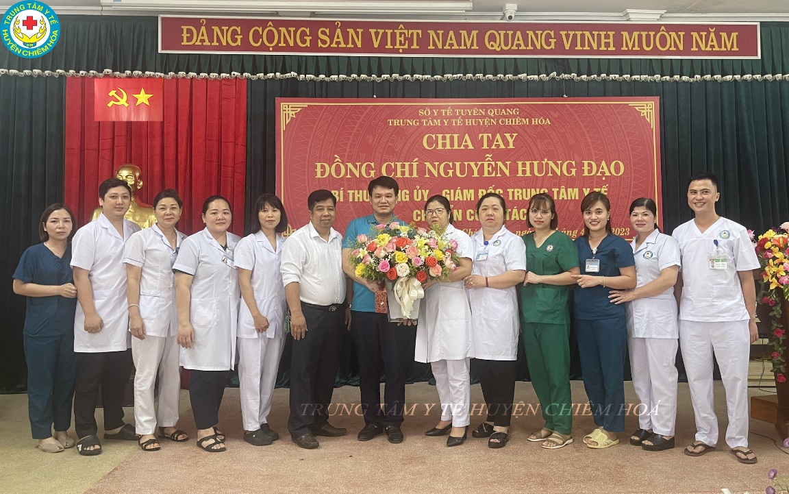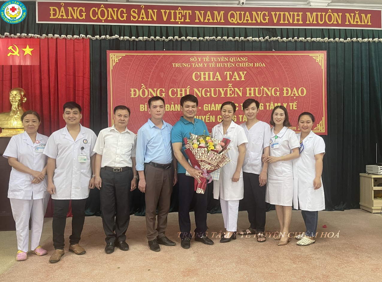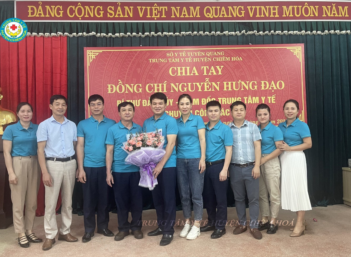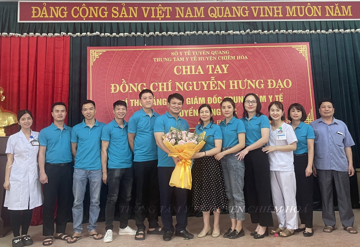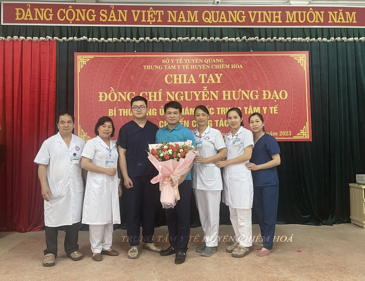 Thực hiện Quyết định số 288/QĐ-UBND ngày 12/04/2023 của Ủy ban nhân dân tỉnh Tuyên Quang về việc chuyển công tác đối với viên chức, lãnh đạo quản lý, đồng chí Nguyễn Hưng Đạo được bổ nhiệm giữ chức vụ Giám đốc Bệnh viện đa khoa tỉnh Tuyên Quang. Vừa qua, TTYT huyện Chiêm Hóa đã tổ chức gặp mặt chia tay đồng chí Nguyễn Hưng Đạo, nguyên Giám đốc Trung tâm Y tế huyện Chiêm Hóa về đơn vị công tác mới.