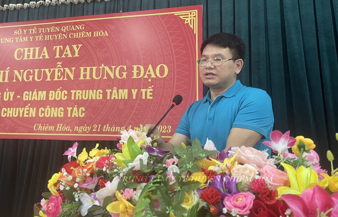 Phát biểu tại buổi chia tay, đồng chí Hà Thị Bích Ngọc, Phó Giám đốc TTYT huyện Chiêm Hoá khẳng định: Đồng chí Nguyễn Hưng Đạo đã luôn nỗ lực, phấn đấu hoàn thành xuất sắc nhiệm vụ được giao. Trong gần 9 năm công tác tại TTYT huyện Chiêm Hoá với cương vị là Giám đốc, đồng chí luôn phát huy năng lực, trí tuệ, kinh nghiệm để cùng Trung tâm thực hiện tốt công khám, chữa bệnh cho nhân dân. Thay mặt cho cán bộ viên chức, NLĐ Trung tâm, đồng chí Hà Thị Bích Ngọc, Phó Giám đốc TTYT huyện Chiêm Hoá đã gửi tới đồng chí Nguyễn Hưng Đạo cùng gia đình lời chúc sức khỏe, hạnh phúc và mong muốn đồng chí trên cương vị công tác mới, đồng chí tiếp tục quan tâm, giúp đỡ, hỗ trợ TTYT huyện Chiêm Hoá trên mọi lĩnh vực.