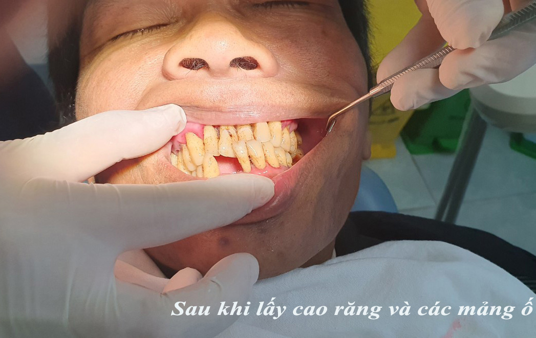 Một bệnh nhân 55 tuổi, xã Trung Hoà đến TTYT huyện Chiêm Hoá để khám răng với tình trạng chân răng lung lay, mảng bám tại chân răng rất nhiều, nướu hai hàm răng viêm đỏ. Bệnh nhân cho biết, răng xuất hiện mảng bám từ rất lâu, đau răng nhưng không đi khám ở cơ sở y tế nào và chưa lấy cao răng bao giờ. Đến khi thấy tình trạng chân răng lung lay bệnh nhân mới đến TTYT huyện để khám và mong muốn được nhổ toàn bộ răng để lắp răng mới.