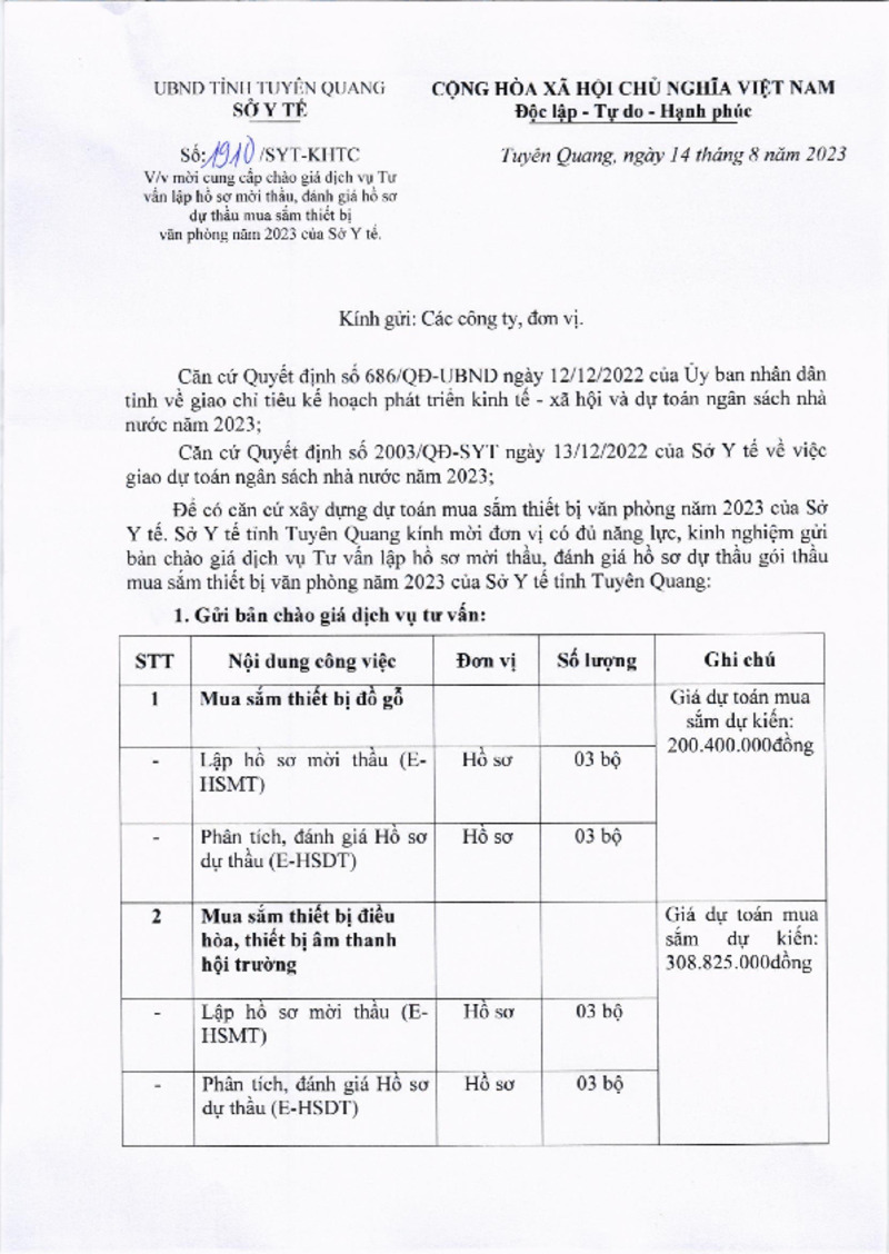 Công văn số 1801/SYT-NVYD về việc mời cung cấp chào giá dịch vụ tư vấn thẩm định hồ sơ mời thầu, thẩm định kết quả lựa chọn nhà thầu gói thầu mua sắm TBYT tập trung năm 2023 của Sở Y tế tỉnh Tuyên Quang