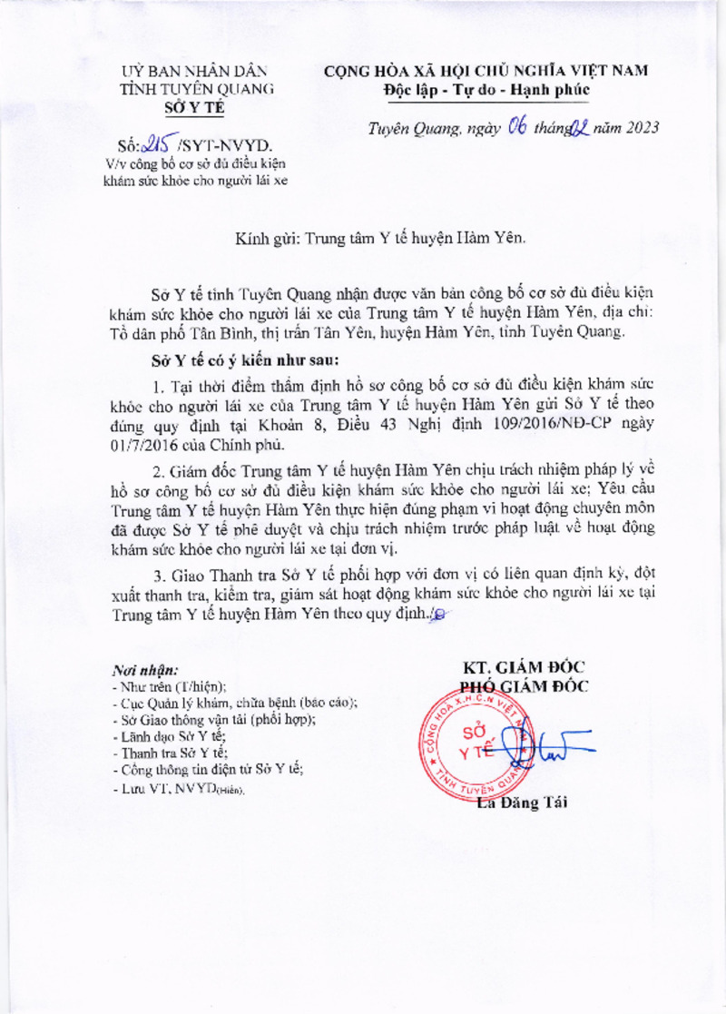 | Mô tả | Công văn số 215/SYT-NVYD về việc công bố cơ sở đủ điều kiện khám sức khỏe cho người lái xe - Trung tâm Y tế huyện Hàm Yên |