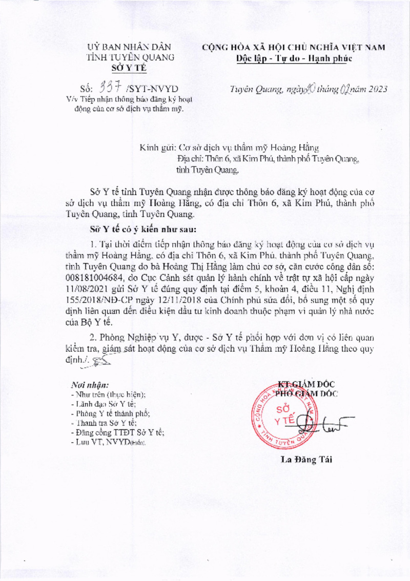 | Mô tả | Công văn số 337/SYT-NVYD V.v tiếp nhận thông báo đăng ký hoạt động của cơ sở dịch vụ thẩm mỹ Hoàng Hằng |