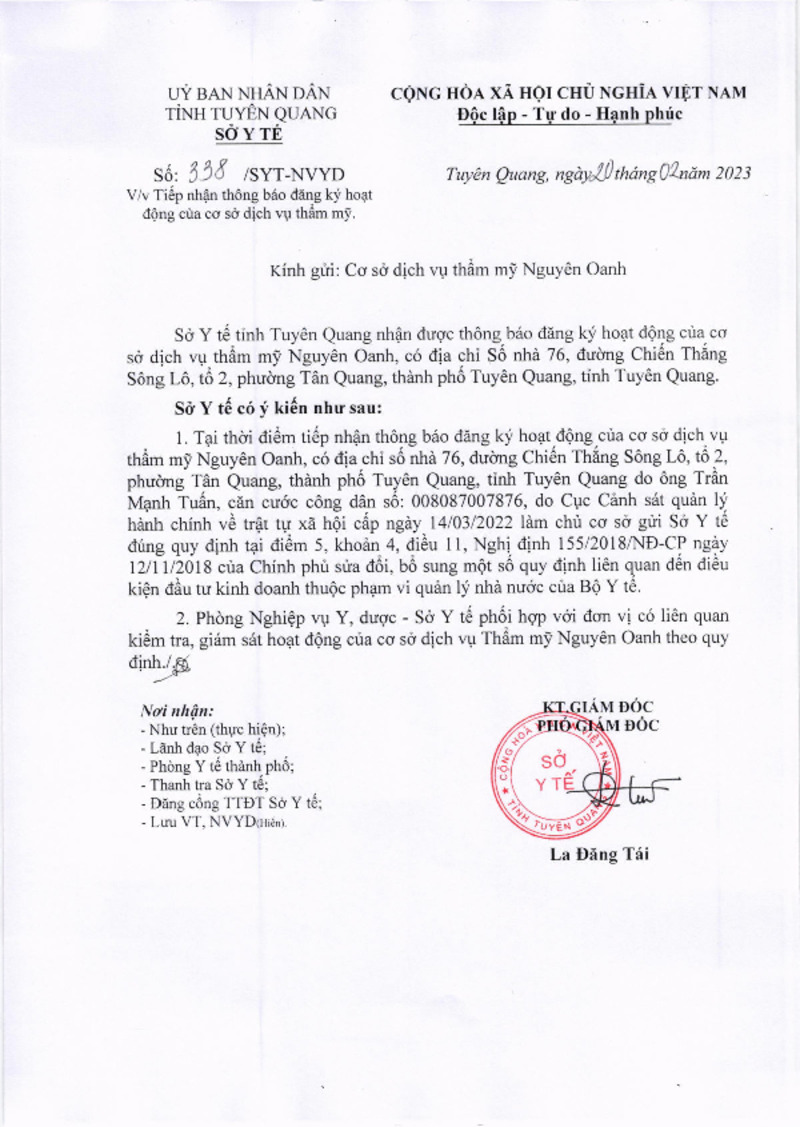 Công văn số 339/SYT-NVYD V.v tiếp nhận thông báo đăng ký hoạt động của cơ sở dịch vụ thẩm mỹ Nguyễn Oanh