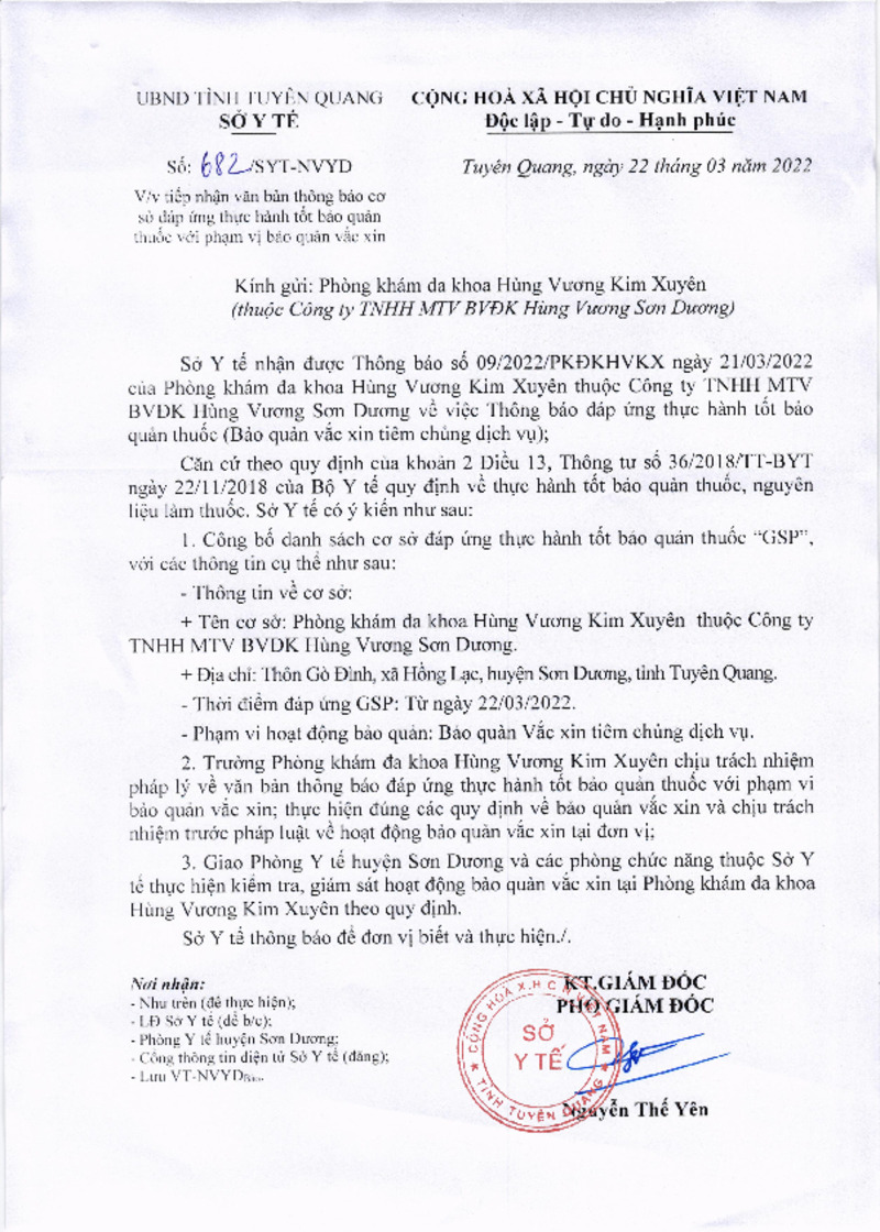 | Mô tả | Công văn số 682/SYT-NVYD về việc tiếp nhận văn bản thông báo cơ sở đáp ứng thực hành tốt bảo quản thuốc với phạm vị bảo quản vác xin - PK ĐK Hùng Vương Kim Xuyên |