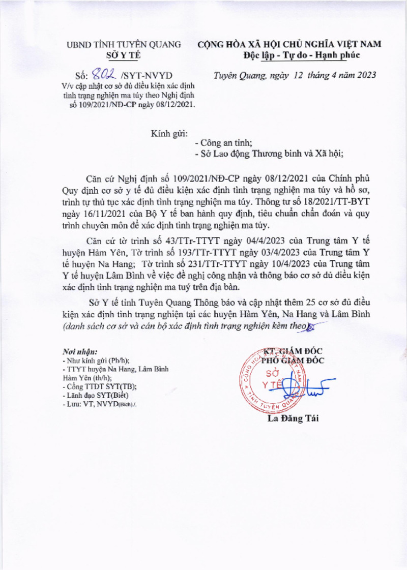 | Mô tả | Công văn số 802/SYT-NVYD Về việc cập nhật cơ sở đủ điều kiện xác định tình trạng nghiện ma túy theo Nghị định số 109/2021/NĐ-CP ngày 08/12/2021 - 25 cơ sở đủ điều kiện của các huyện: Hàm Yên, Na Hang, Lâm Bình |