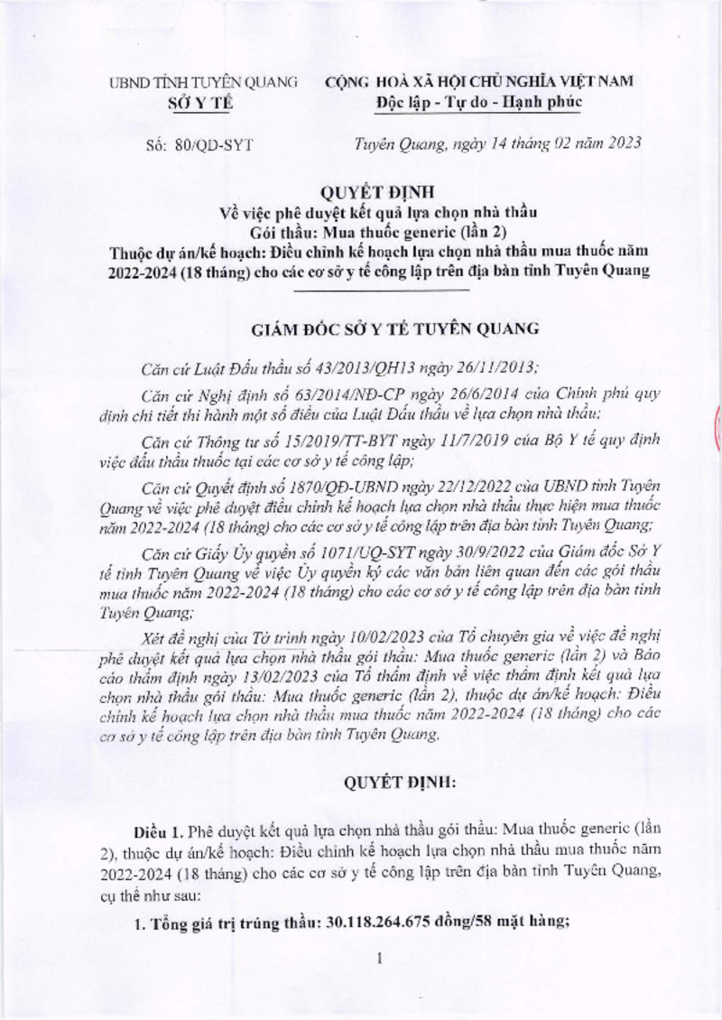 | Mô tả | Quyết định số 80/QĐ-SYT về việc phê duyệt kế hoạch lựa chọn nhà thầuGói thầu: Mua thuốc Generic (lần 2) |