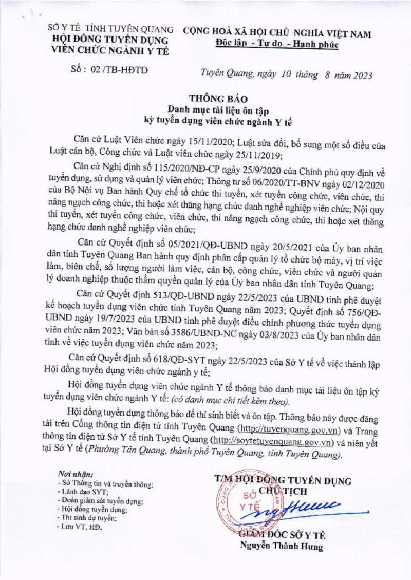 | Số hiệu | 02/TB-HĐTD | Cơ quan ban hành | Sở Y tế |