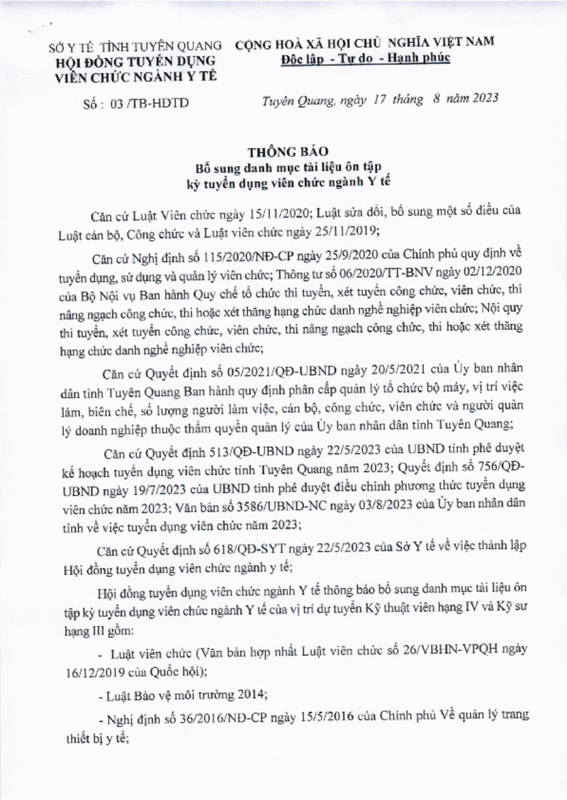 | Mô tả | Thông báo số 03/TB-HĐTD bổ sung danh mục tài liệu ôn tập kỳ tuyển dụng viên chức ngành Y tế |