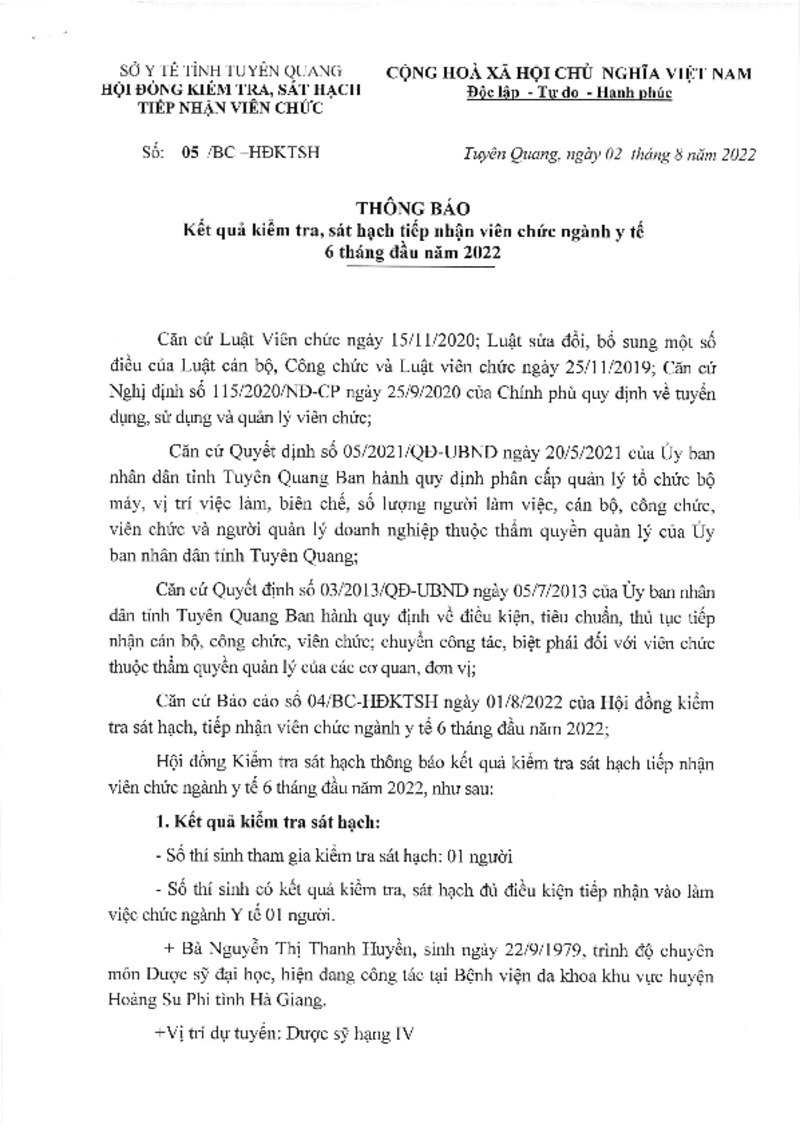 | Tiêu đề văn bản | Thông báo số 05/TB-HĐKTSH Kết quả kiểm tra, sát hạch tiếp nhận viên chức ngành y tế 6 tháng đầu năm 2022 | ||