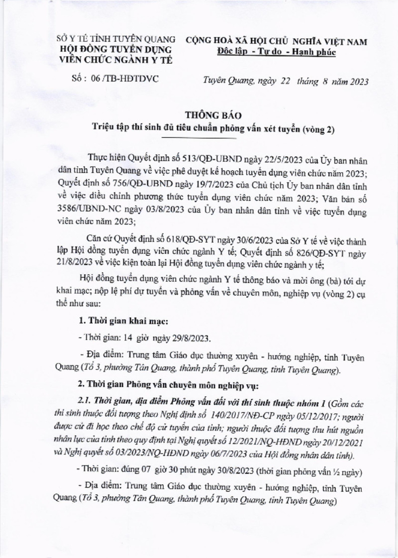 | Tiêu đề văn bản | Thông báo số 06/2023/TB-HĐTDVC Triệu tập thí sinh đủ tiêu chuẩn phỏng vấn xét tuyển (vòng 2) | ||