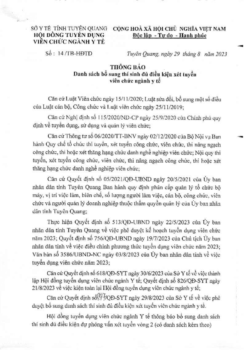 | Tiêu đề văn bản | Thông báo số 14/2023/TB-HĐTD Danh sách bổ sung thí sinh đủ điều kiện xét tuyển viên chưc ngành y tế | ||
