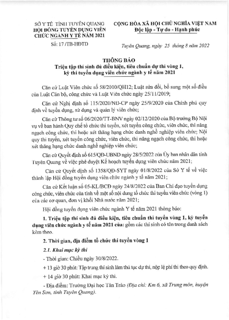 | Tiêu đề văn bản | Thông báo số 17/TB-HĐTD Triệu tập thí sinh đủ điều kiện, tiêu chuẩn dự thi vòng 1, kỳ thi tuyển dụng viên chức ngành y tế năm 2021 | ||