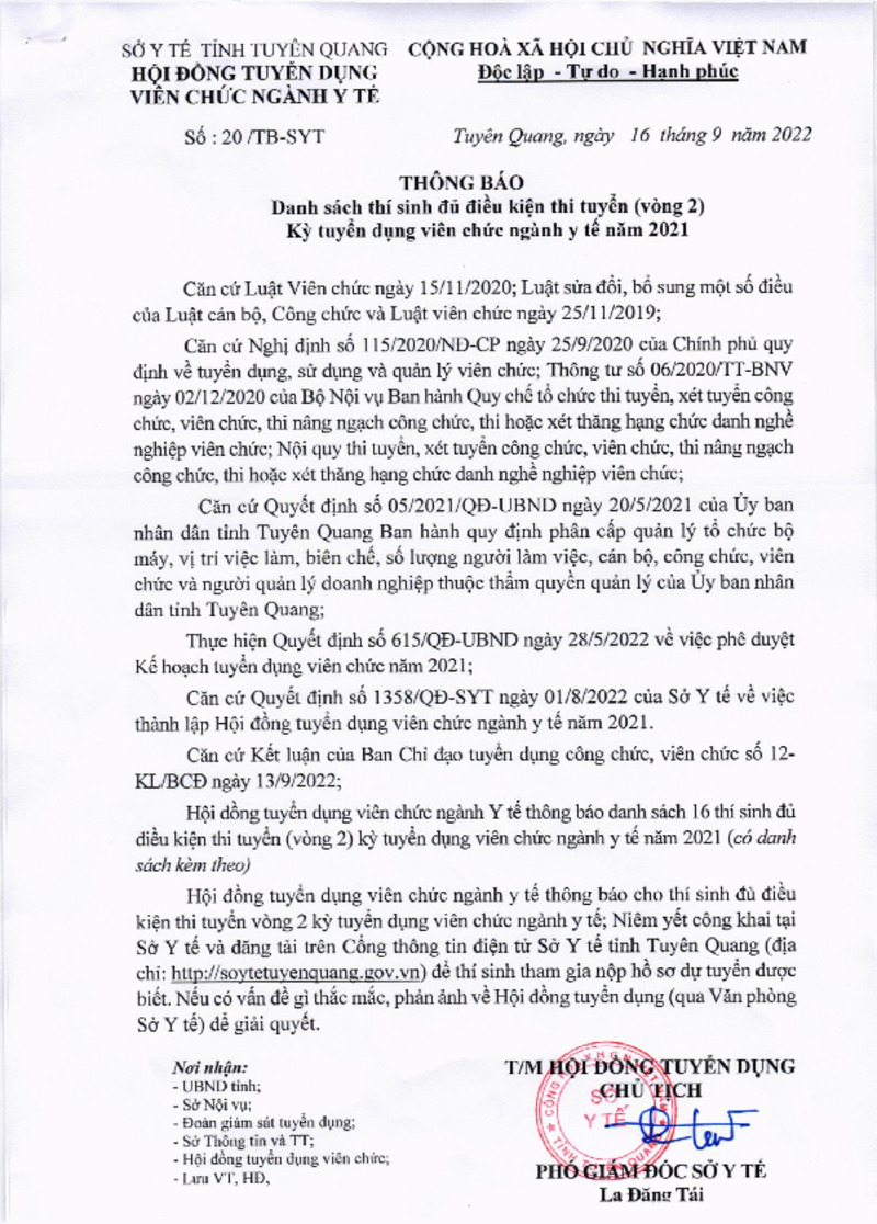 | Mô tả | Thông báo số 20/TB-SYT Danh sách thí sinh đủ điều kiện thi tuyển (vòng 2) Kỳ thi tuyển viên chức ngành y tế năm 2021 |
