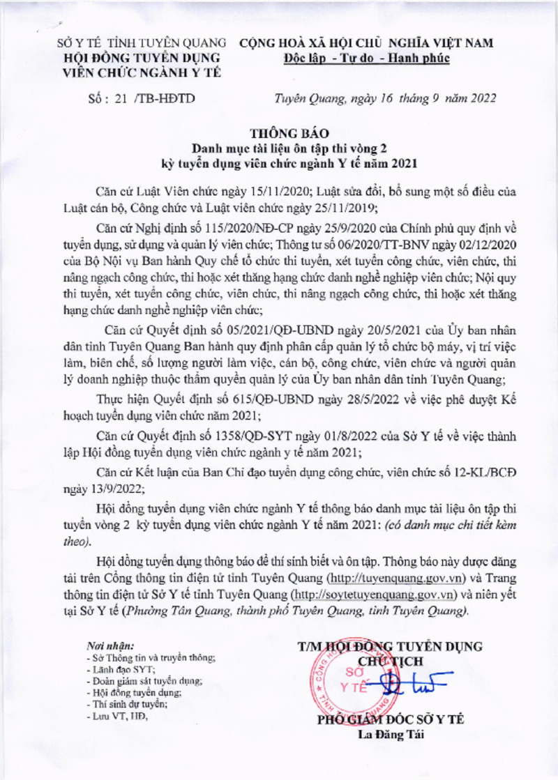 | Mô tả | Thông báo số 21/TB-SYT Danh mục tài liệu ôn tập thi tuyển (vòng 2) Kỳ thi tuyển viên chức ngành y tế năm 2021 |