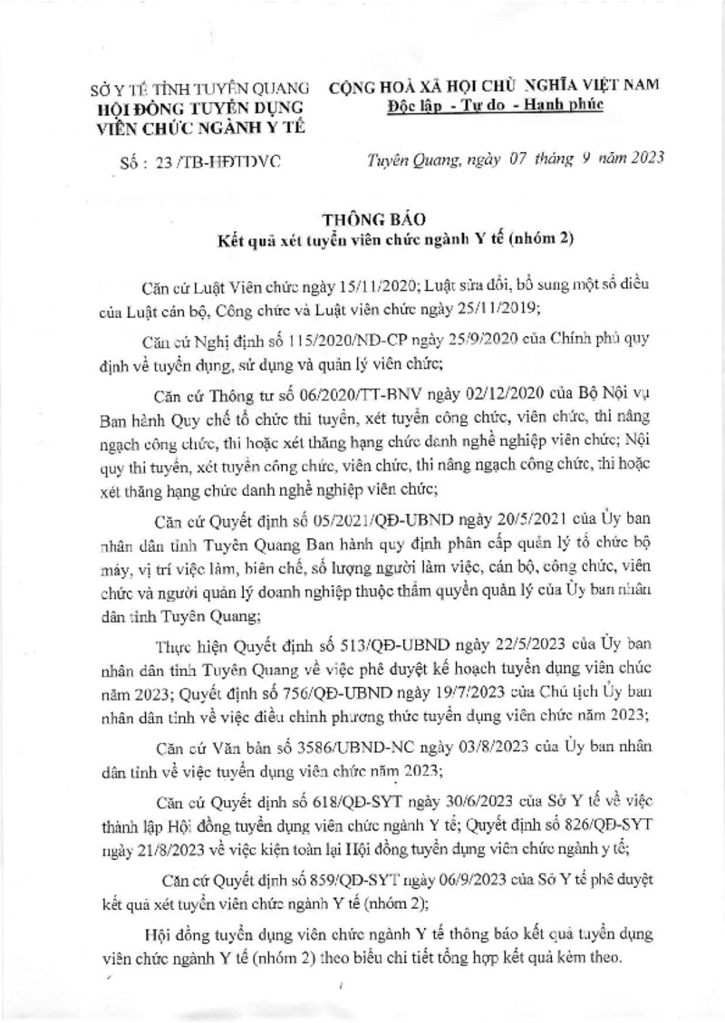 | Tiêu đề văn bản | Thông báo số 23/2023/TB-HĐTDVC Thông báo kết quả xét tuyển viên chức ngành Y tế (nhóm 2) | ||