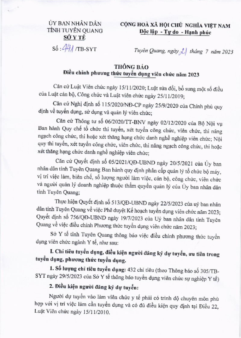 | Mô tả | Thông báo số 441/2023/TB-SYT Điều chỉnh phương thức tuyển dụng viên chức năm 2023 |