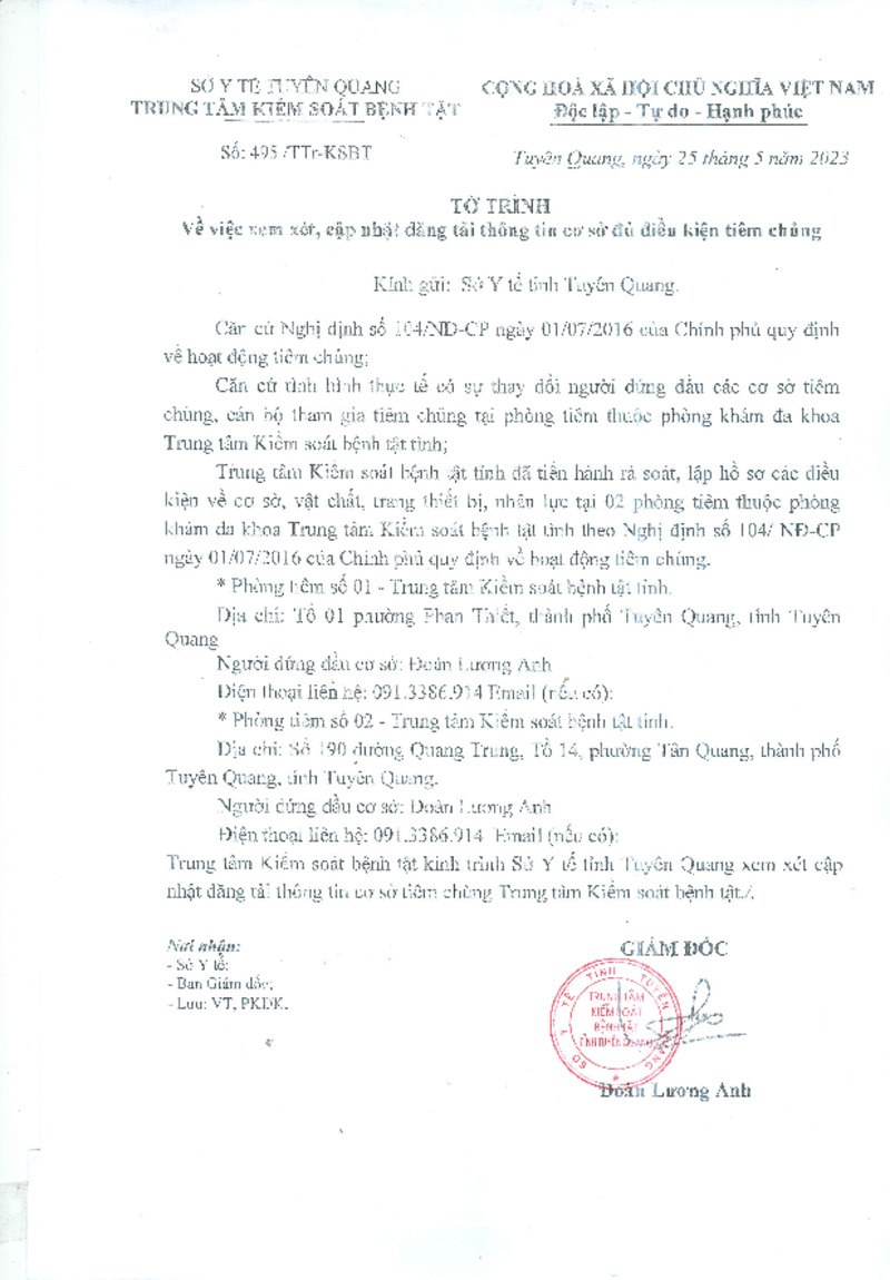 Ngày 25/5/2023, Trung tâm Kiểm soát bệnh tật tỉnh ban hành Thông báo số 496/TT-KSBT cơ sở đủ điều kiện tiêm chủng