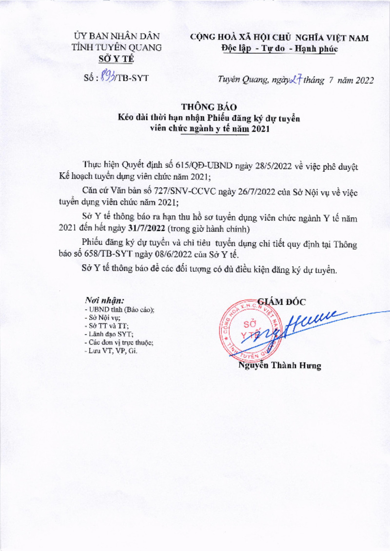 | Mô tả | Thông báo số 893/TB-SYT kéo dài thời hạn nhận Phiếu đăng ký dự tuyển viên chức ngành y tế năm 2021 |